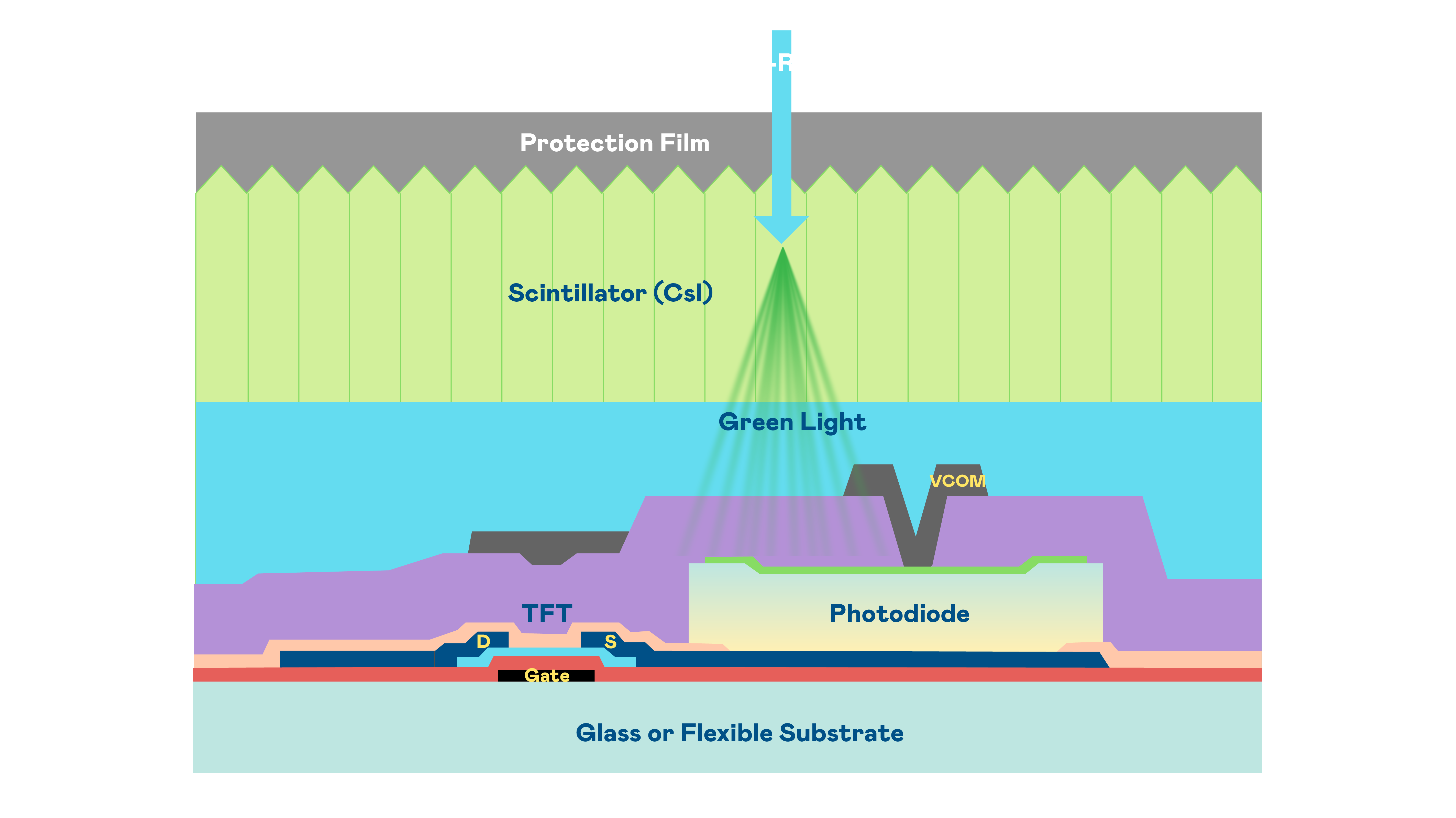 HJC黄金城的X光影像感测阵列使用薄膜电晶体 (TFT) 作为每个像素的读取开关,搭配光电二极体(Photodiode)的光电转换元件,用以感测X光影像讯号。